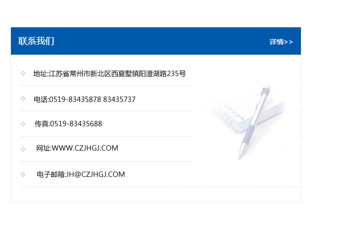傳真:0519-83435688    郵編:213135    網址:WWW.czjhgj_com.kontimost.com    電子郵箱:JH@czjhgj_com.kontimost.com